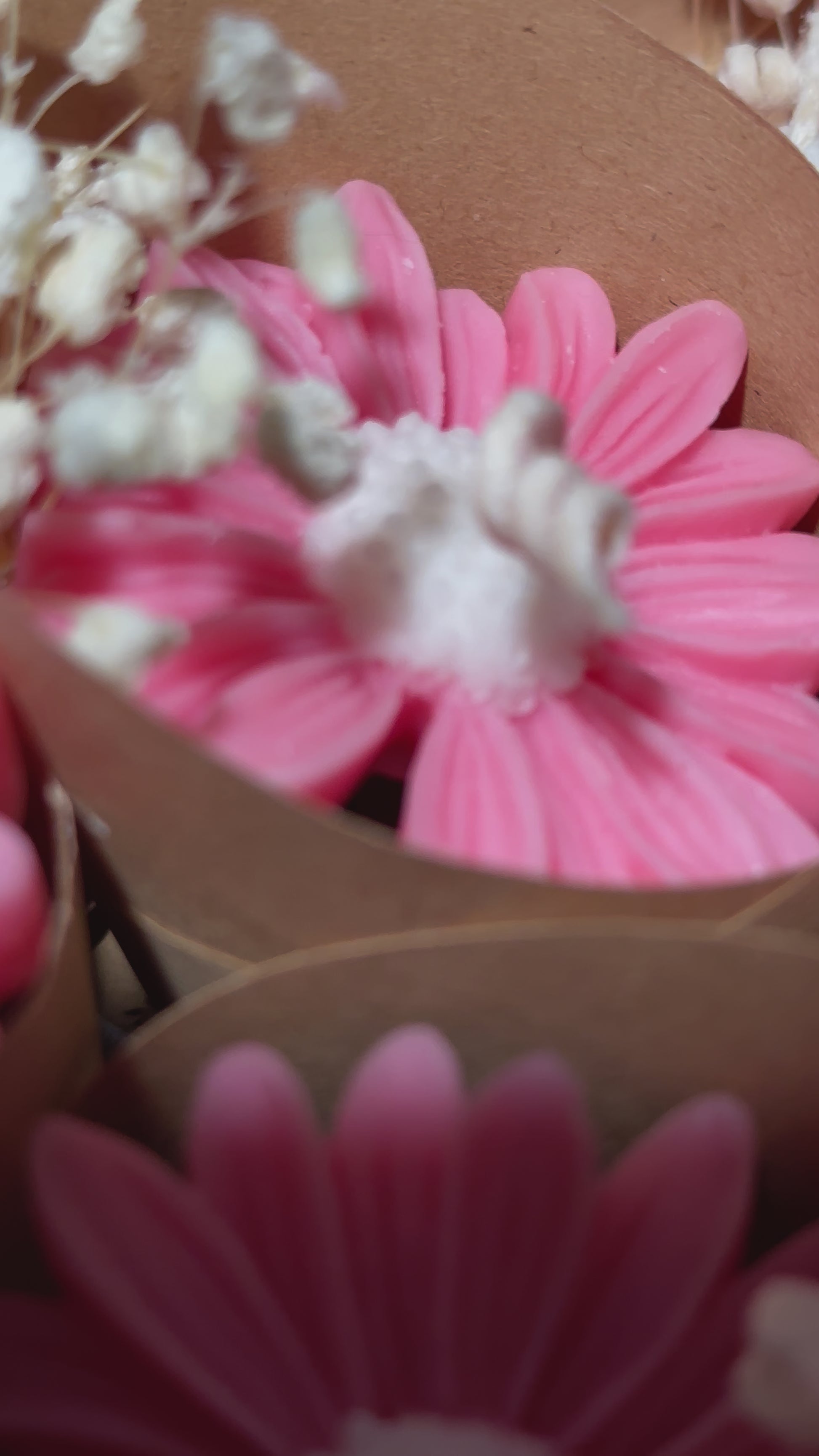 A colorful single daisy on a stick. Beautiful floral scented candle packed as an individual bouquet.